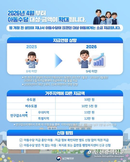 [인천광역신문] 최예준 기자 | 2026년 4월부터 아동수당 대상·금액이 확대됩니다.