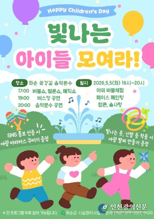 [인천광역신문] 최예준 기자 | 화순군은 어린이날을 맞아 아이와 가족이 함께 즐기는 대규모 체험형 축제를 마련해 ‘아동친화도시’의 면모를 한층 강화한다고 밝혔다.
