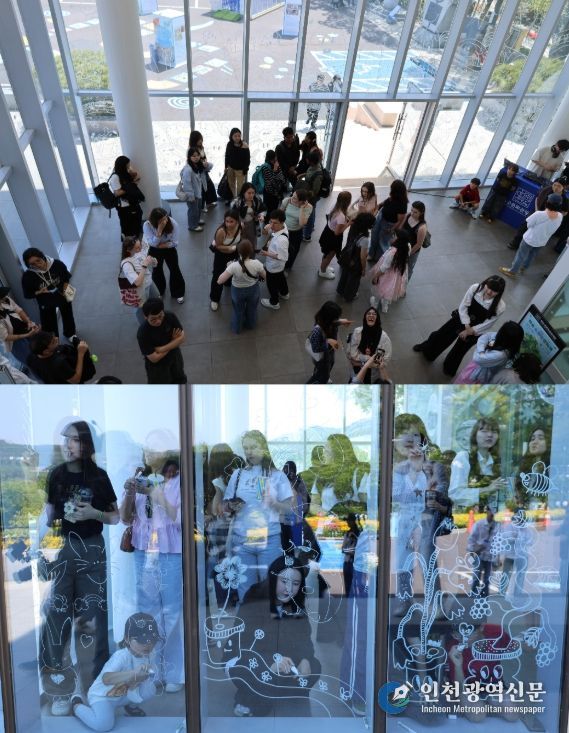 통유리 외벽 전체를 캔버스로 활용한 퍼포먼스에 음악이 더해지며 현장 분위기를 한층 끌어올렸다.