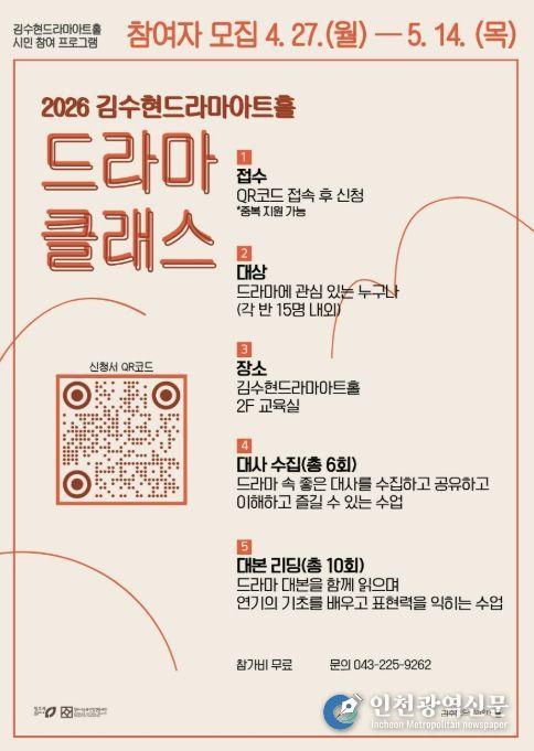 청주시문화산업진흥재단이 운영하는 국내 유일의 드라마문학관 김수현드라마아트홀은 5월 14일까지 ‘드라마 클래스’참여자를 모집한다고 29일 밝혔다.