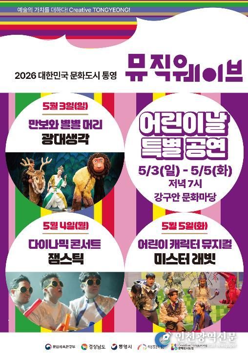 [인천광역신문] 최예준 기자 | (재)통영문화재단은 어린이날을 맞아 오는 5월 3일부터 5일까지 3일간 오후 7시 강구안 문화마당에서 2026 뮤직웨이브 어린이날 특별공연‘만보와 별별머리’,‘다이나믹 콘서트’,‘미스터 래빗’을 진행한다.