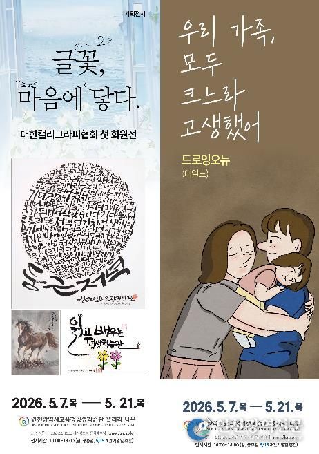 [인천광역신문] 최예준 기자 | 인천광역시교육청평생학습관은 5월 7일부터 21일까지 관내 갤러리 '나무'와 '다솜'에서 '글꽃, 마음에 닿다'와 '우리 가족, 모두 크느라 고생했어' 전시를 각각 개최한다.