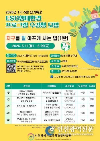 [인천광역신문] 최예준 기자 | 인천광역시교육청평생학습관은 4월 29일부터 인천시민을 대상으로 '지구를 덜 아프게 사는 법' ESG 생태환경 프로그램 1기 수강생을 모집한다.