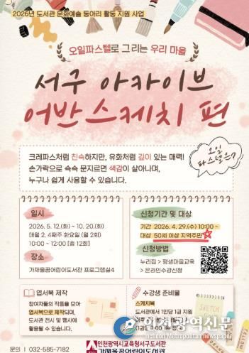 [인천광역신문] 최예준 기자 | 인천광역시교육청서구도서관은 29일부터 50세 이상 지역 주민을 대상으로 우리 마을의 풍경을 그림으로 기록하는 문화예술 프로그램 ‘서구 아카이브 어반스케치 편’ 참여자를 모집한다.