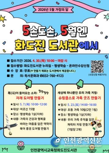 [인천광역신문] 최예준 기자 | 인천광역시교육청화도진도서관은 5월 가정의 달을 맞아 유·초등생 동반 가족과 어르신을 대상으로 세대 맞춤형 프로그램 ‘5손도손, 5월엔 화도진도서관에서’를 운영한다.