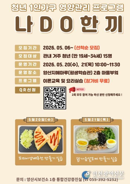[인천광역신문] 최예준 기자 | 양산시보건소는 청년 1인 가구의 건강한 식생활 형성과 자가 영양 관리 능력 향상을 위한 영양 관리 프로그램 ‘나DO한끼’를 5월 20일과 5월 21일 이틀간 운영한다고 밝혔다.