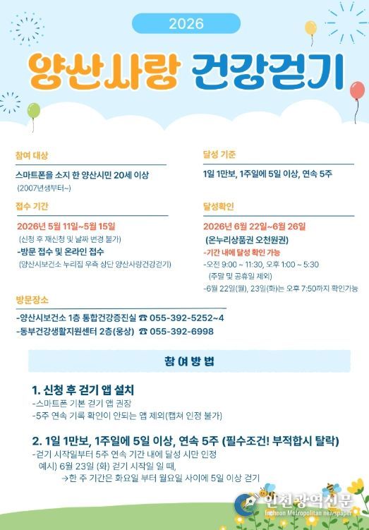 [인천광역신문] 최예준 기자 | 양산시는 시민들의 신체활동 증진과 건강한 생활습관 형성을 위해 ‘양산사랑 건강걷기’사업의 2차 접수를 5월 11일부터 5월 15일까지 진행한다고 밝혔다.
