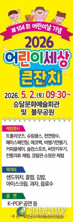 [인천광역신문] 최예준 기자 | 무안군은 제104회 어린이날을 맞아 오는 5월 2일 승달문화예술회관과 불무공원 일원에서 ‘2026 어린이세상 큰잔치’를 연다고 밝혔다.