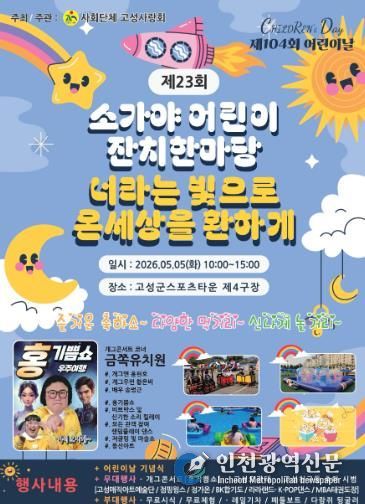 [인천광역신문] 최예준 기자 | 고성군은 제104회 어린이날을 맞아 ‘너라는 빛으로 온 세상을 환하게’를 슬로건으로, 오는 5월 5일 오전 10시 스포츠타운 4구장에서 ‘제104회 어린이날 행사 및 제23회 소가야어린이 잔치 한마당’을 개최한다고 밝혔다.