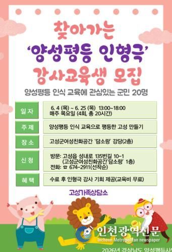 양성평등 인형극 강사에 관심이 있는 군민은 고성군여성친화공간 담소랑 1층 고성가족상담소에 방문 또는 전화로 신청 가능하다.