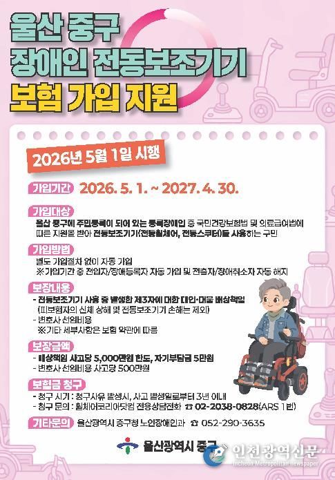 [인천광역신문] 최예준 기자 | 울산 중구가 오는 5월 1일부터 ‘울산 중구 장애인 전동보조기기 보험 지원사업’을 시행한다.