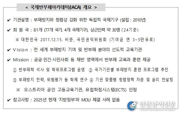 IACA는 유엔마약범죄사무소(UNODC), 오스트리아 정부, 유럽부패방지총국(OLAF) 등이 2010년 10월 설립한 최초의 반부패 교육 전담 국제기구로, 우리나라는 2011년 12월 IACA 협정을 비준했다. 현재 IACA에는 77개 국가와 4개 국제기구가 회원으로 활동하고 있다.