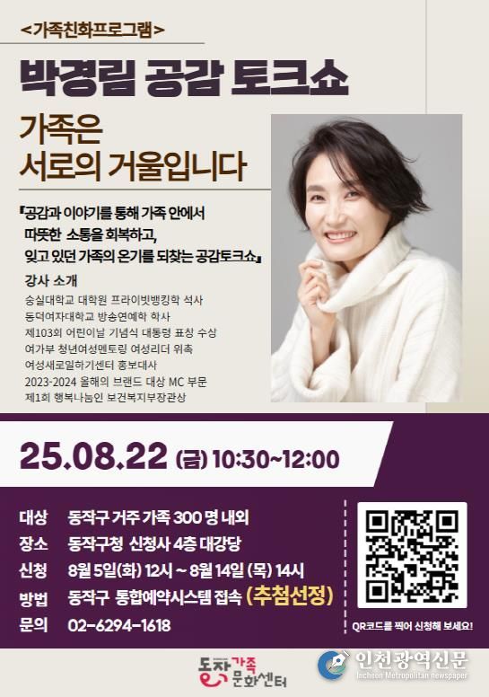 [인천광역신문] 최훈 기자 | 동작구가 오는 8월 22일 오전 10시 30분, 구청 4층 대강당에서 방송인 박경림과 함께하는 ‘가족 친화 공감 토크쇼’를 개최한다고 밝혔다.