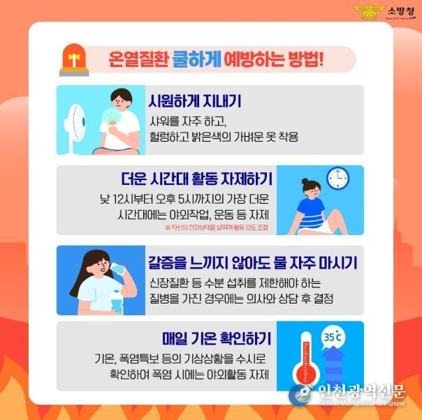 [인천광역신문] 최예준 기자 | 인천시 계양소방서는 지속적인 폭염으로 인해 시민들의 온열질환 피해를 최소화하기 위한 예방 활동과 홍보를 강화한다고 5일 밝혔다.