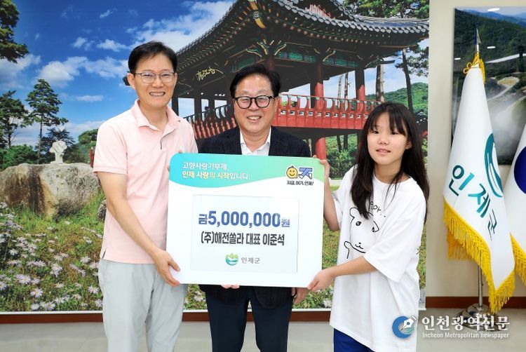 [인천광역신문] 관리자 기자 | ㈜해전쏠라 이준석 대표가 12일 인제군에 고향사랑기부금 500만원을 기탁하고 인제군의 발전을 응원했다. ㈜해전쏠라는 김천에 본사를 둔 내진 태양광 특허기업으로, 태양광 설계‧제작 및 시공을 전문으로 하는 기업이다.