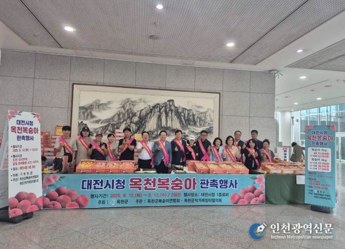 [인천광역신문] 관리자 기자 | 옥천군은 농가소득 증대와 옥천 복숭아의 우수성 홍보를 위해 엄선된 최고 품질의 복숭아로 12일 대전시청에서 판촉 행사를 진행했다.