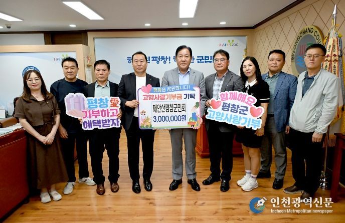 [인천광역신문] 관리자 기자 | 재안산평창군민회(회장 윤수용, 회원 68명)는 지난 5월 안산시 한대역 앞 로데오거리에서 ‘제3회 오늘은 평창 장날’ 바자회 행사를 개최하고 발생한 수익금과 평창사랑상품권 등 총 600만 원을 고향 사랑 실천을 위해 14일 평창군청을 찾아 심재국 평창군수에게 전달했다.
