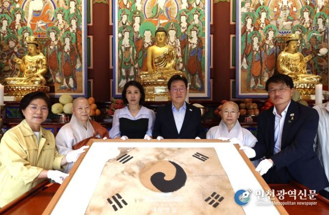 [인천광역신문] 관리자 기자 | 이재명 대통령 내외는 17일 오후 서울 은평구에 위치한 진관사를 방문했다. 진관사는 일제강점기 일장기 위에 먹물로 태극문양과 4괘를 덧칠해 만든 '진관사 태극기'와 독립신문이 발견된 역사적인 사찰이다.