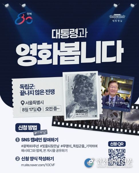 [인천광역신문] 관리자 기자 | 이재명 대통령은 17일 오전, 김혜경 여사와 함께 서울 소재 한 영화관에서 '독립군 : 끝나지 않은 전쟁'을 관람했다.