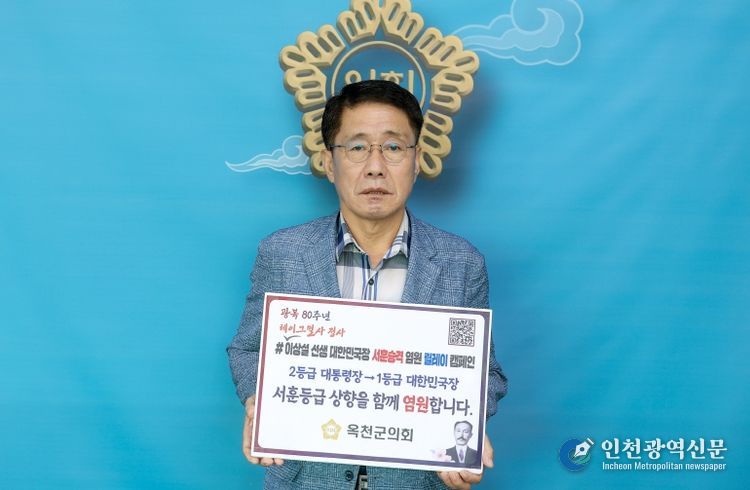 [인천광역신문] 관리자 기자 | 옥천군의회 추복성 의장이 8월 18일, 독립운동가 이상설 선생의 서훈을 대통령장(2등급)에서 대한민국장(1등급)으로 승격을 염원하는 릴레이 캠페인에 동참했다.