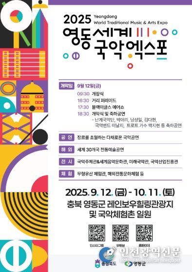 [인천광역신문] 관리자 기자 | 문화체육관광부가 지원하고 충청북도 영동군이 주최하는 대한민국 최초 국악 박람회인 ‘2025 영동세계국악엑스포’가 9월 12일부터 10월 11일까지 충북 영동군 레인보우힐링관광지와 국악체험촌 일원에서 열린다.