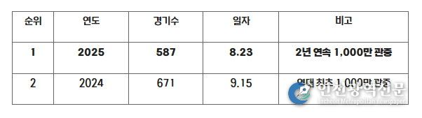 587경기만에 1,000만 관중을 달성하며, 역대 최초 1,000만 관중을 달성한 2024시즌 671경기만의 1,000만 관중 달성 기록을 84경기 단축했다.