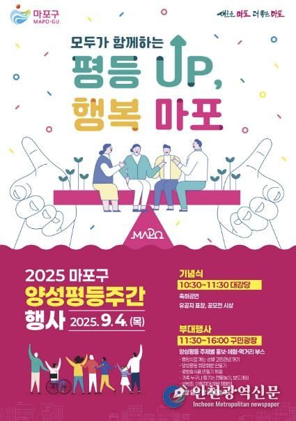 [인천광역신문] 최훈 기자 | 마포구는 9월 1일부터 7일까지 이어지는 양성평등주간을 맞아 양성평등 문화 확산과 인식 제고를 위해 9월 4일 목요일, 마포구청 대강당과 구민광장에서 ‘제30회 양성평등주간 기념행사’를 개최한다.