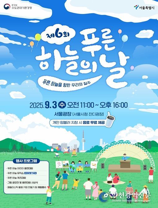 [인천광역신문] 최훈 기자 | 서울시는 환경부 소속 수도권대기환경청과 함께 9월 3일 서울광장에서 11시부터 16시까지 ‘제6회 푸른 하늘의 날’ 수도권 지역 행사를 개최한다.