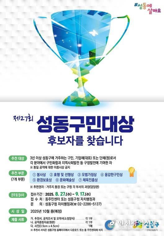 [인천광역신문] 최훈 기자 | 서울 성동구는 오는 9월 17일까지 지역사회 발전과 밝고 건전한 사회 기풍 조성에 크게 기여한 구민 및 단체를 대상으로 '제27회 성동구민대상' 후보자를 추천받는다고 밝혔다.