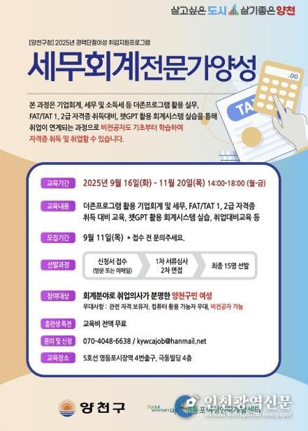 [인천광역신문] 최훈 기자 | 양천구는 경력단절여성의 실질적인 재취업을 지원하기 위해 실무 중심의 ‘세무회계 전문가 양성과정’을 개설하고, 오는 11일까지 수강생을 모집한다고 밝혔다.