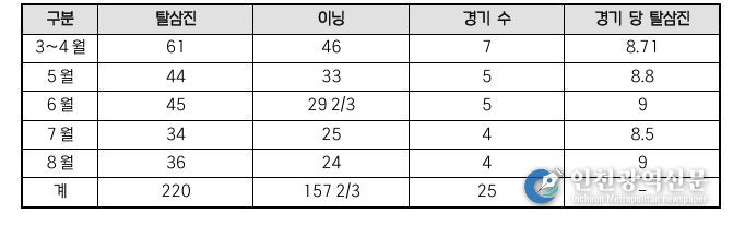 경기 내에서도 이닝 별로 큰 기복없이 1회부터 6회까지 비슷한 비율의 탈삼진 개수를 기록하고 있다. 1회 탈삼진이 33개로 전체 탈삼진의 15%를 차지하고, 6회에도 31탈삼진, 전체 14.1%로 비슷한 비율을 기록하며 경기 중-후반부에서도 힘이 떨어지지 않는 모습을 보여주고 있다.