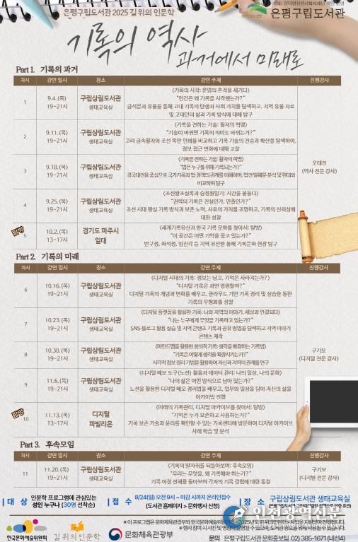 [인천광역신문] 최훈 기자 | 서울 은평구는 은평구립도서관이 오는 4일부터 11월 20일까지 매주 목요일, 기록문화의 흐름을 따라 인간과 공동체의 삶을 성찰하는 인문학 프로그램 ‘기록의 역사, 과거에서 미래로 : 돌벽에 새긴 문자에서 인공지능까지’를 운영한다고 밝혔다.