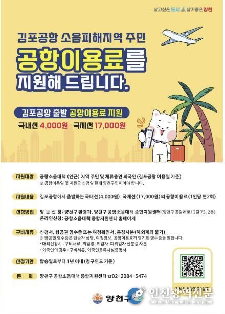 [인천광역신문] 최훈 기자 | 양천구는 만성적인 항공기 소음으로 피해를 겪고 있는 공항소음대책지역 주민들을 위해 김포공항 출발 국제선·국내선 공항이용료를 지원한다고 4일 밝혔다.