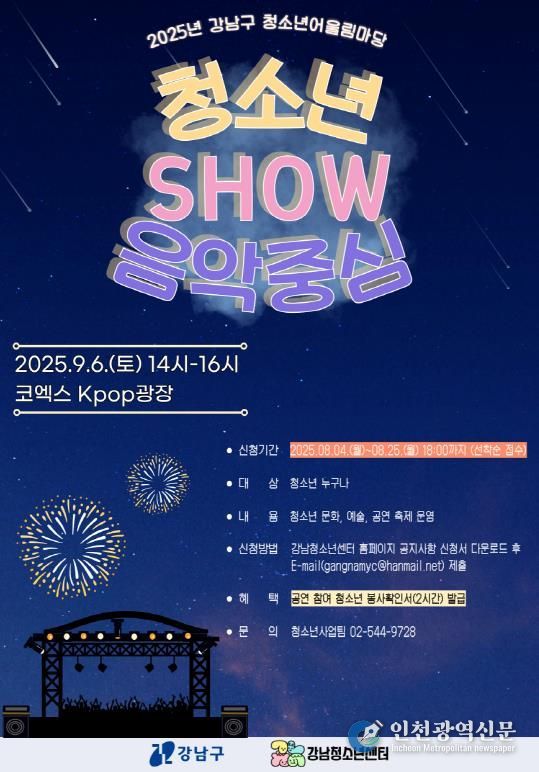 [인천광역신문] 최훈 기자 | 꿈이 모이는 도시, 미래를 그리는 강남구가 오는 9월 6일 코엑스 K-pop 광장에서 청소년 어울림 마당 ‘청소년 Show 음악중심’과 ‘친환경 문화축제–꼬리별 야시장’을 연다. 낮에는 청소년 공연 무대, 밤에는 친환경 야시장으로 이어지며, 청소년과 지역 주민이 함께 어울리는 특별한 하루가 펼쳐질 예정이다.