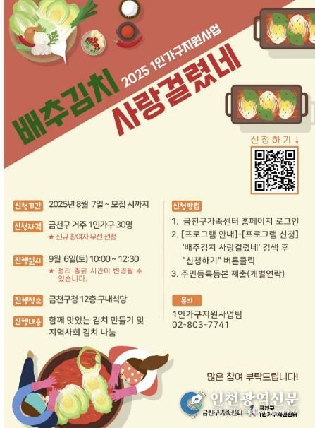 [인천광역신문] 최훈 기자 | 금천구는 9월 6일 오전 10시 금천구청 구내식당에서 1인가구 김장 행사 ‘배추김치 사랑걸렸네’ 를 개최한다고 밝혔다.