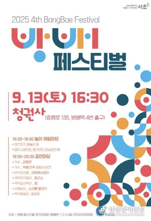 [인천광역신문] 최훈 기자 | 서울 서초구 곳곳에서는 9월 한 달 동안 가족과 이웃이 함께 즐길 수 있는 다채로운 축제가 펼쳐진다. 각 동네별 특색 있는 프로그램과 문화 행사가 준비돼 가을을 더욱 특별하게 만들어줄 행사들이다.