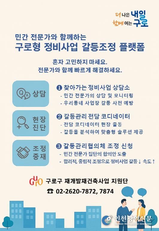 [인천광역신문] 최훈 기자 | 구로구가 정비사업 추진 과정에서 반복되는 갈등과 분쟁을 예방하고 안정적인 사업 진행을 지원하기 위해 ‘민간 중심 구로형 정비사업 갈등조정 플랫폼’을 본격 운영한다.