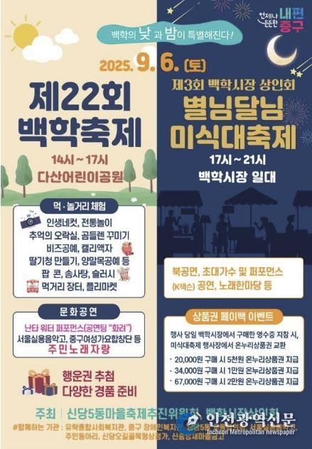 [인천광역신문] 최훈 기자 | 서울 중구가 오는 6일 신당5동 대표축제인 '백학축제'와 백학시장의 '별님달님 미식대축제'를 나란히 개최한다.