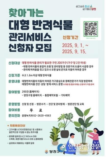 [인천광역신문] 최훈 기자 | 양천구는 대형 반려식물을 키우고 있지만, 관리에 어려움을 겪고 있는 가정을 전문가가 방문해 맞춤 관리해주는 ‘찾아가는 대형 반려식물 관리서비스’를 추진하고, 오는 15일까지 사전 신청받는다.