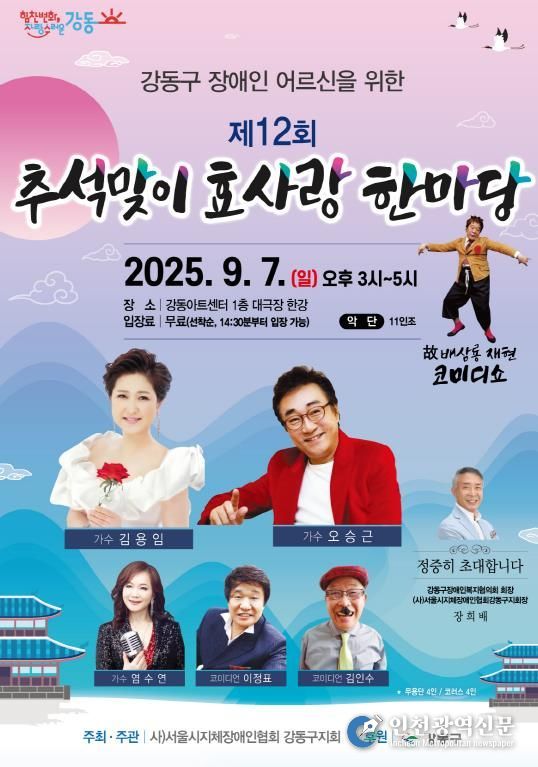[인천광역신문] 최훈 기자 | 강동구는 관내 장애 어르신들이 따뜻한 명절을 보낼 수 있도록 오는 9월 7일 오후 3시, 강동아트센터 대극장 한강에서 ‘제12회 추석맞이 효사랑 한마당’을 개최한다고 5일 밝혔다.