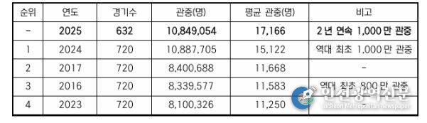 [인천광역신문] 관리자 기자 | KBO 리그가 단일 시즌 역대 최다 관중 신기록 수립을 눈앞에 두고 있다. 9월 4일(목)까지 KBO 리그는 632경기만에 1,084만 9,054명의 관중이 야구장을 찾아 기존 단일 시즌 최다 관중 기록이었던 2024시즌의 1,088만 7,705명에 3만 8,651명을 남겨 뒀다. 출범 첫 시즌이었던 1982년 총 143만 8,768명의 관중으로 시작했던 KBO 리그는 마흔 네번째 시즌 만에 2년 연속 1,000만 관중을 넘어서는 프로스포츠 리그로 성장했다.