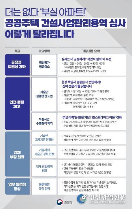 [인천광역신문] 관리자 기자 | 조달청은 공공건설 현장의 입찰 비리와 부실 문제를 해결하고 공공주택 건설사업관리용역의 질적 수준을 높이기 위해 ‘공공주택 건설사업관리용역 심사 관련 규정 2종’을 전면적으로 개정해 9월 10일부터 본격적으로 시행한다고 밝혔다.