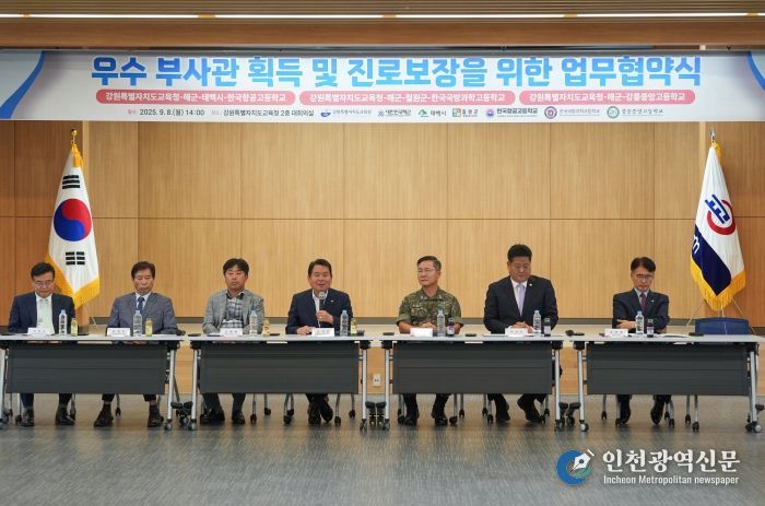 [인천광역신문] 관리자 기자 | 강원특별자치도교육청은 9월 8일 14시 본청에서 해군(준장 박태규)·태백시(시장 이상호)·철원군(군수 이현종)·한국항공고(교장 문명호)·한국국방과학고(교장 이창근)·강릉중앙고(교장 고태환)와 해군 부사관 육성을 위한 업무 협약을 체결했다.