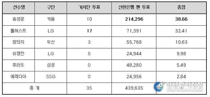 송성문은 기자단 투표 총 35표 중 10표(28.6%), 팬 투표 43만 9,635표 중 21만 4,296 표(48.7%)로 총점 38.66점을 받아, 기자단 투표 17표, 팬 투표 7만 1,391표로 총점 32.41점을 기록한 LG 톨허스트를 제쳤다.
