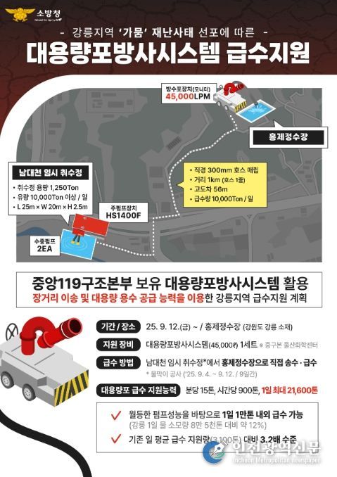 [인천광역신문] 관리자 기자 | 소방청은 장기 가뭄으로 생활용수 확보에 어려움을 겪고 있는 강릉시에 대용량포방사시스템을 긴급 투입해 급수 지원에 나선다고 밝혔다.