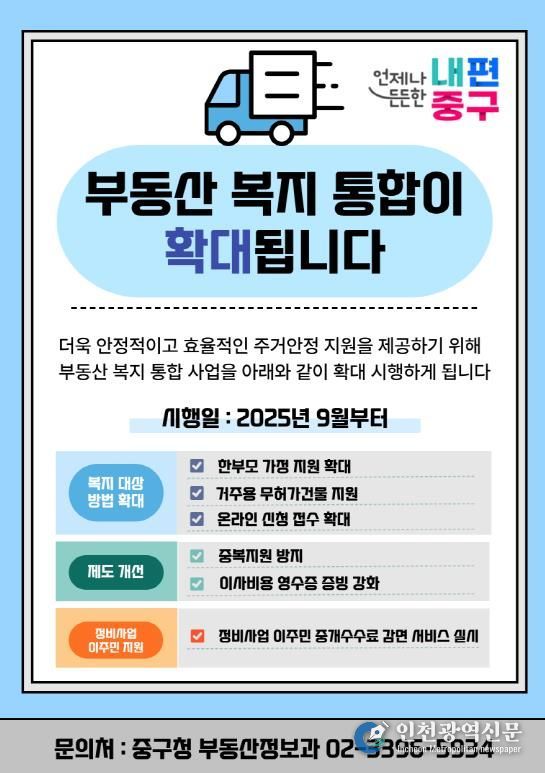 [인천광역신문] 최훈 기자 | 서울 중구가 주거 취약계층의 생활 안정을 돕기 위해 이달부터 부동산 복지 통합 사업을 확대 시행한다.