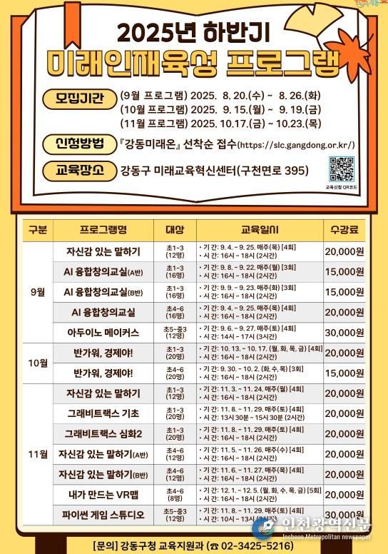 [인천광역신문] 최훈 기자 | 강동구는 4차 산업혁명 시대를 이끌어갈 창의·융합형 인재 양성을 위해 ‘2025 미래인재육성 프로그램’을 오는 9월부터 3개월간 운영한다고 15일 밝혔다.