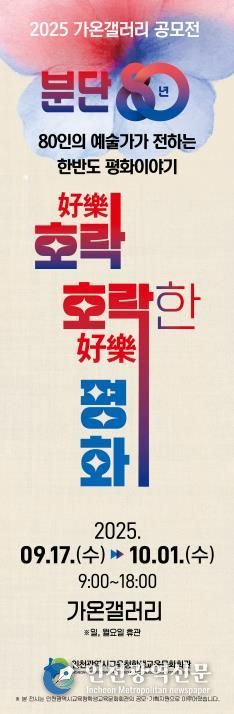 [인천광역신문] 최예준 기자 | 인천광역시교육청학생교육문화회관은 9월 17일부터 10월 1일까지 가온갤러리에서 ‘분단 80년, 80인의 예술가가 전하는 한반도 평화 이야기 - 호락(好樂) 호락(好樂)한 평화’ 전시회를 개최한다.