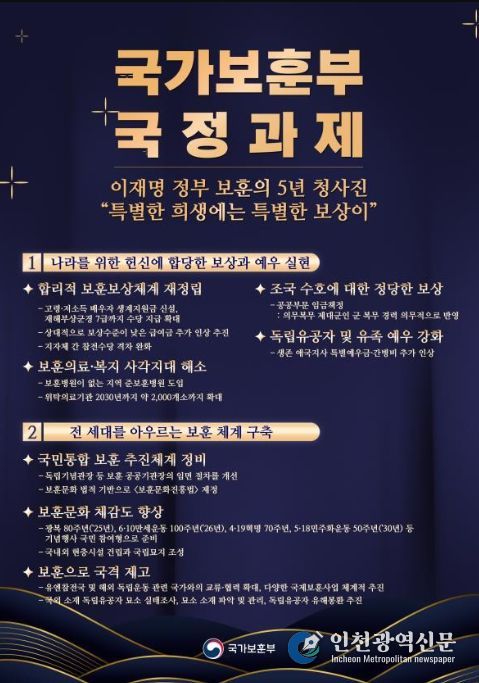 [인천광역신문] 관리자 기자 | 국가보훈부는 16일 새정부 국정과제로 '나라를 위한 헌신에 합당한 보상과 예우 실현', '전 세대를 아우르는 보훈 체계 구축'이 확정됐다고 밝혔다.