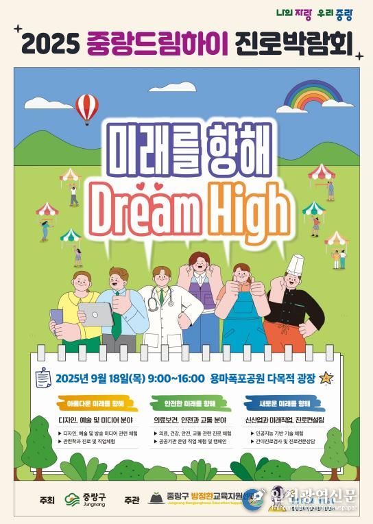 [인천광역신문] 최훈 기자 | 중랑구는 9월 18일 오전 9시부터 오후 4시까지 용마폭포공원 다목적광장에서 ‘2025 중랑드림하이 진로박람회’를 개최한다. 이번 행사는 중랑구가 주최하고 중랑구 방정환교육지원센터와 중랑진로직업체험지원센터가 공동 주관하며, 관내 중학생 2,000여 명과 학부모, 교원, 지역사회 관계자들이 참여한다.